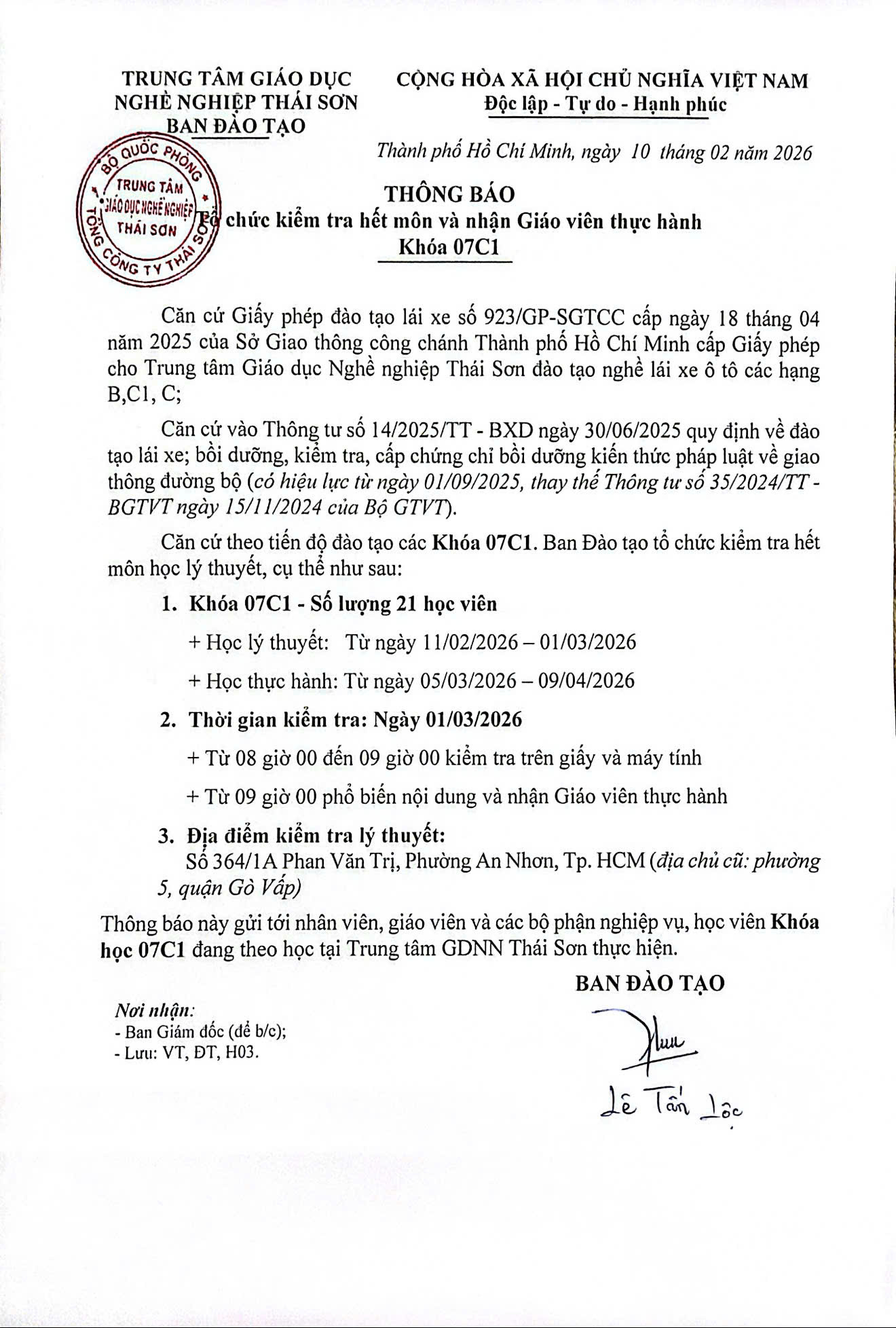 Lịch kiểm tra kết thúc khóa