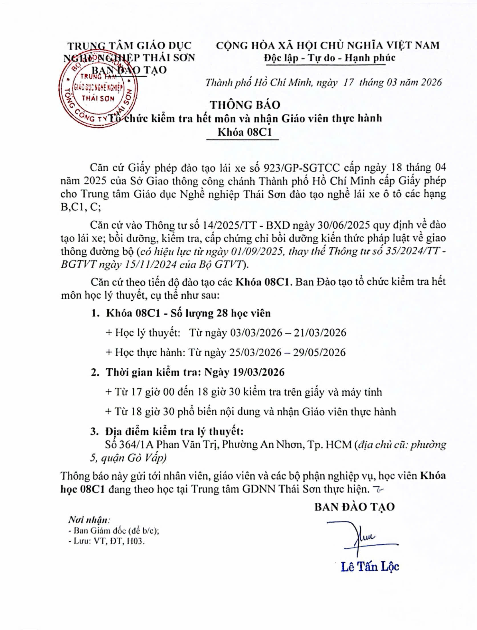 Lịch kiểm tra kết thúc môn 101B- Tự động