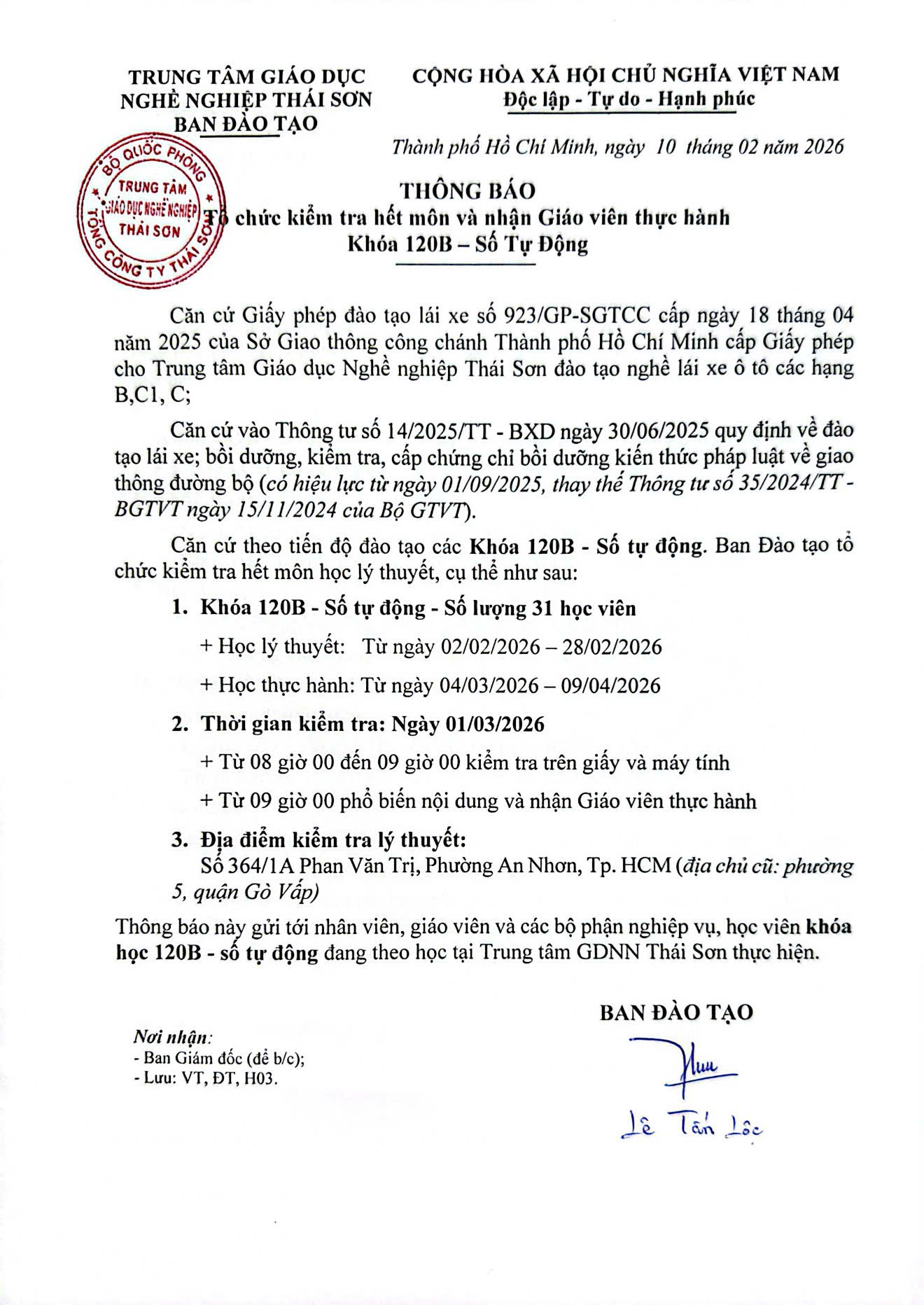 Lịch kiểm tra kết thúc môn 101B- Tự động