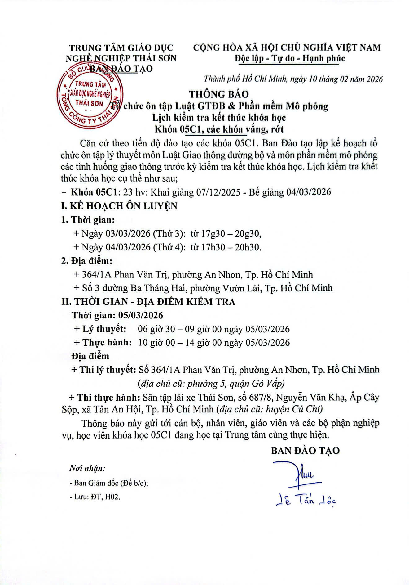 Thông báo lịch kiểm tra kết thúc khóa học 05C1