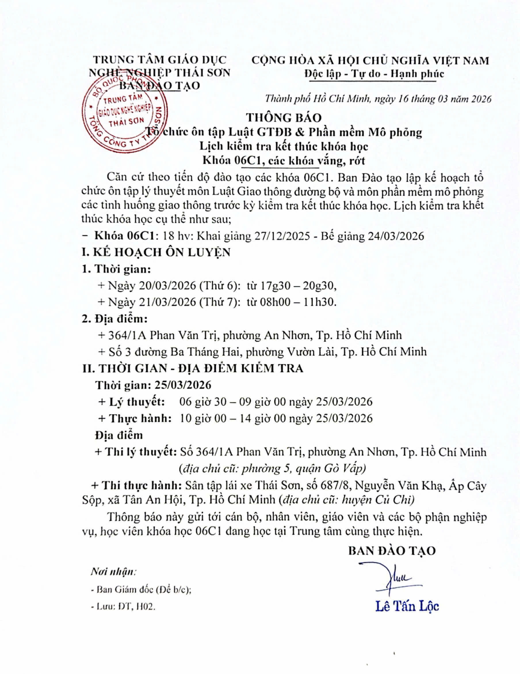 Thông báo lịch kiểm tra kết thúc khóa học 06C1