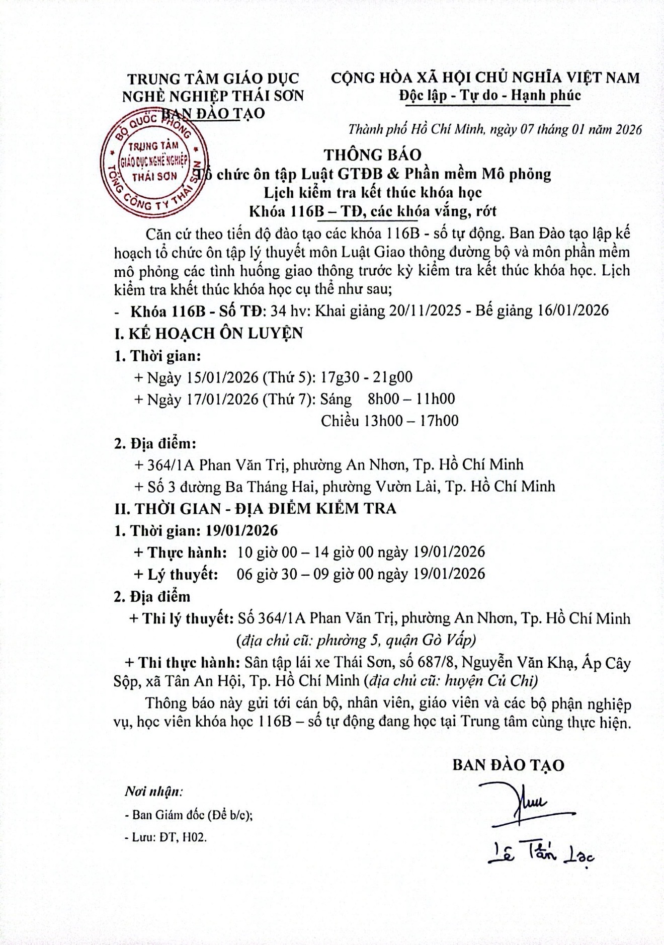 Thông báo lịch kiểm tra kết thúc khóa học 116B-STĐ