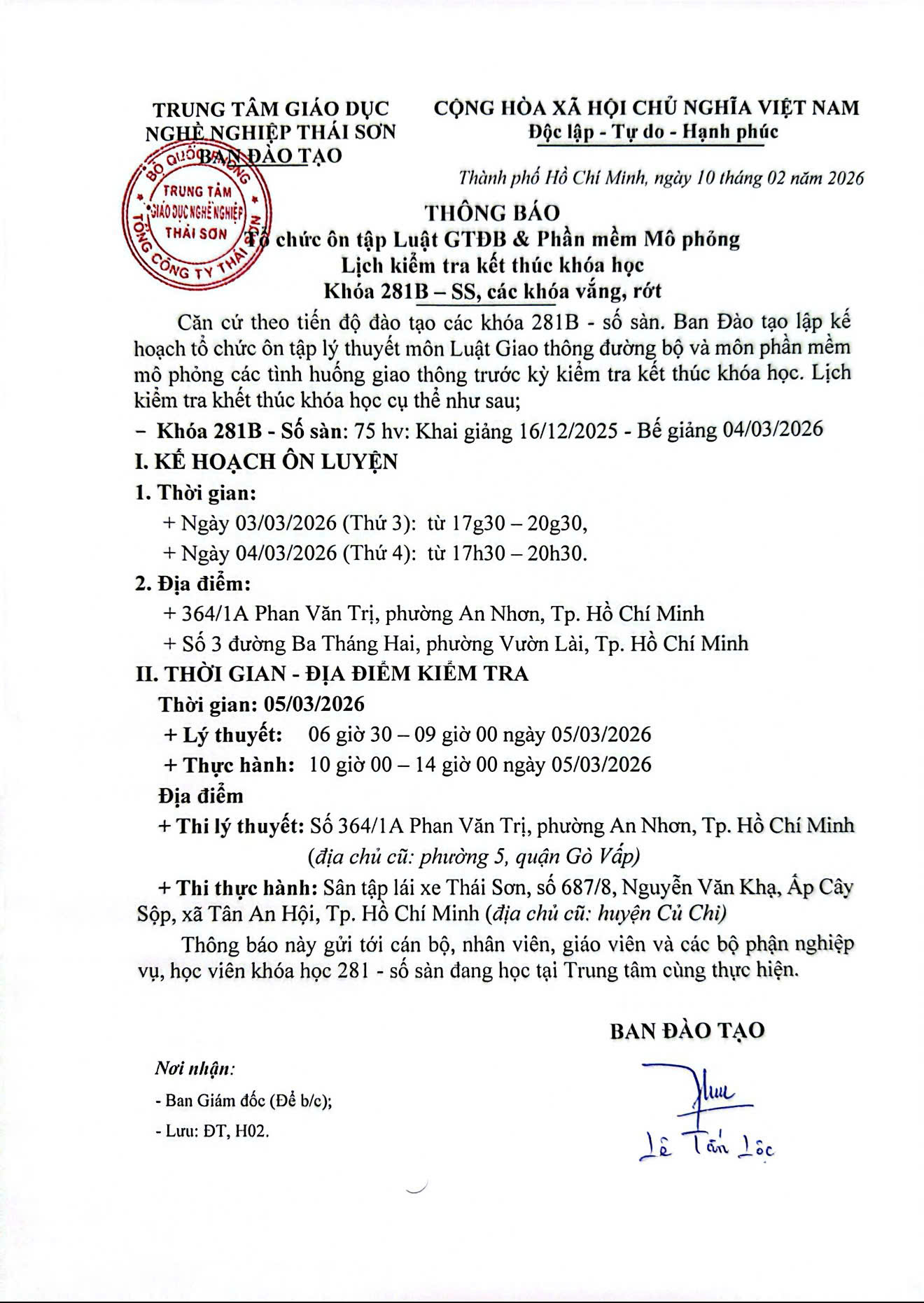 Thông báo lịch kiểm tra kết thúc khóa học 281B-SS