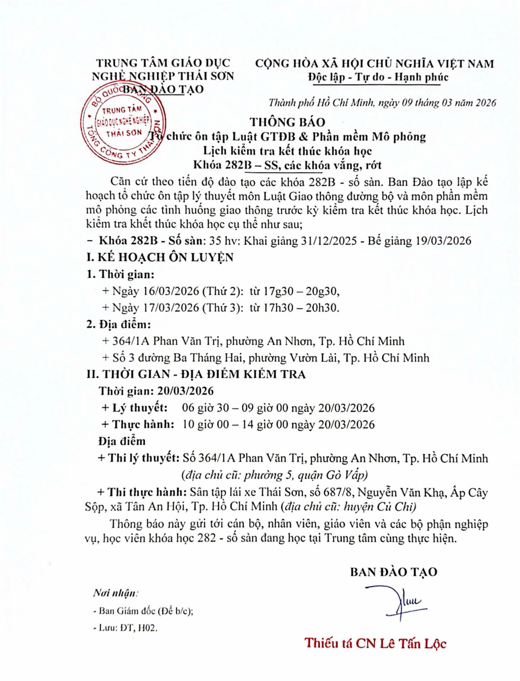 Thông báo lịch kiểm tra kết thúc khóa học 282B-SS