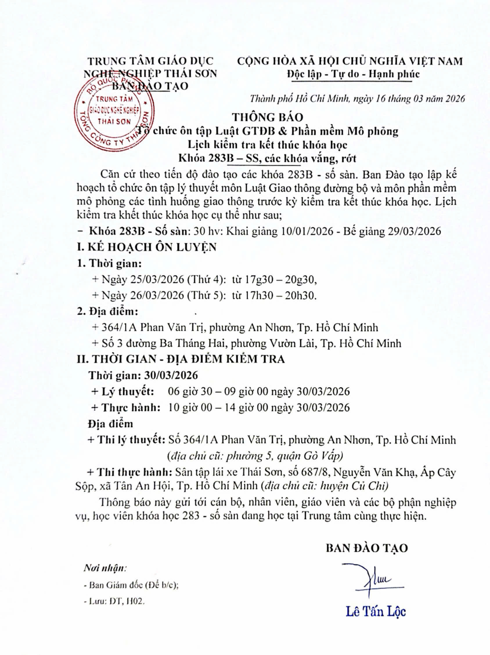 Thông báo lịch kiểm tra kết thúc khóa học 283B-SS